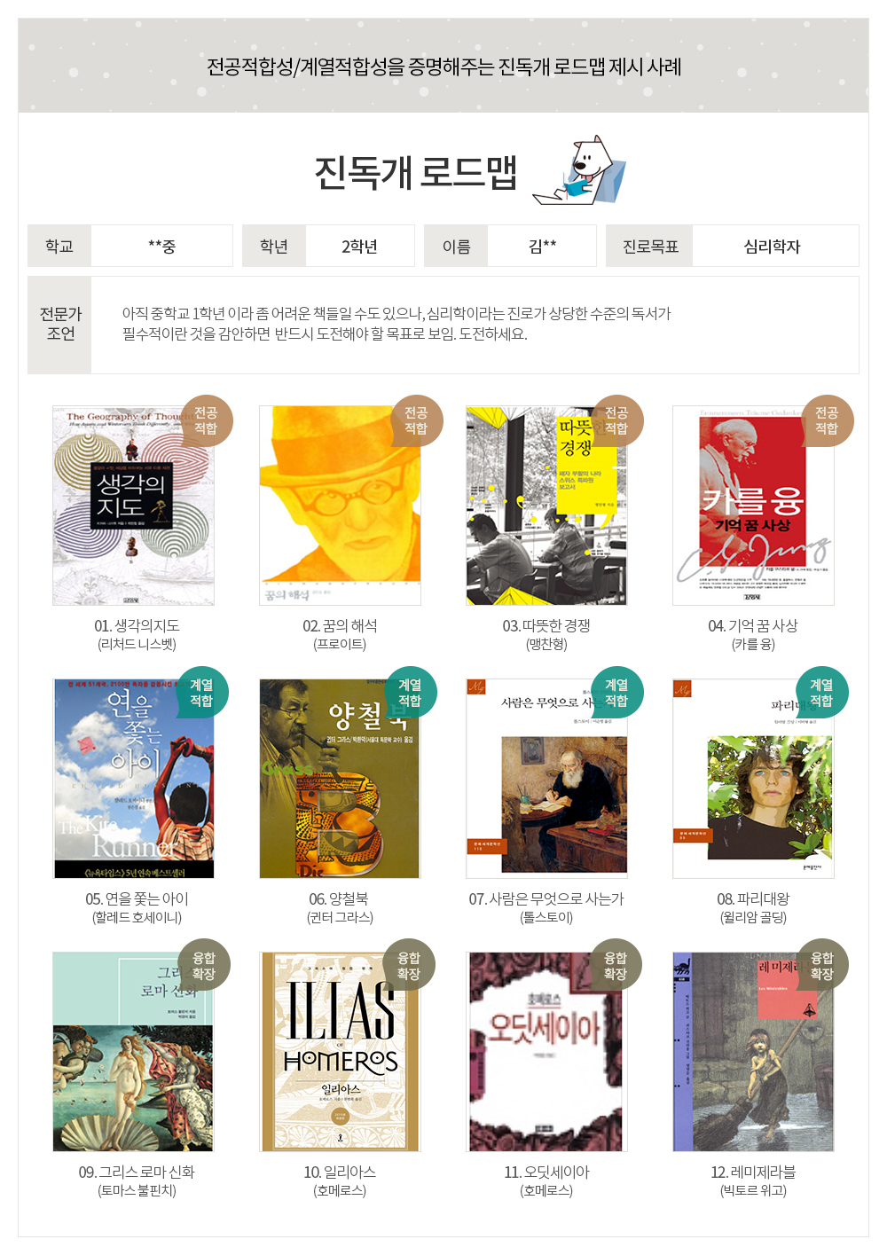 진독개 로드맵은 기본적으로 전공적합, 계열적합, 융합확장 등 세가지 측면서 수준별 도서를 추천합니다. 즉, 진로와 입시 측면에서 맞춤형 솔루션을 제공합니다.